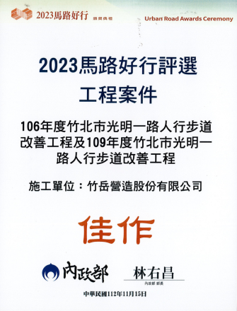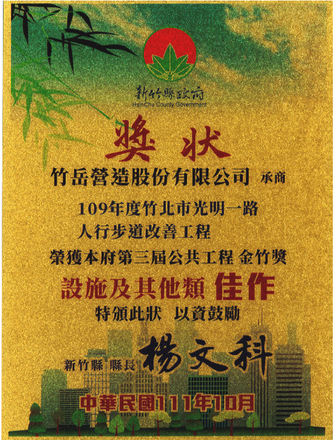 金竹獎-新竹縣政府獎狀